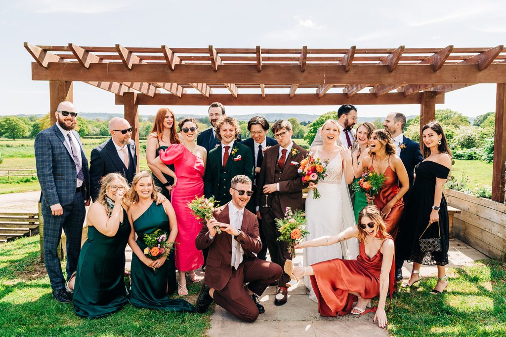 At Southlands Barn’s, we really are spoiled for choice when it comes to wedding photography backdrops. The rolling Sussex countryside, the rustic barns, and picturesque fields create a stunning setting for couple portraits. Sunset shots here are particularly magical, we can drive down to the lake for some gorgeous evening reflections! We can get a mix of indoor and outdoor photos, as the barn’s interiors also provide such a great backdrop. For group photos, we can capture either inside the barn or outside in front of the pergola with the countryside as the background – perfect! And all of these spots are within minutes of each other, meaning you won’t need to leave the fun for long.